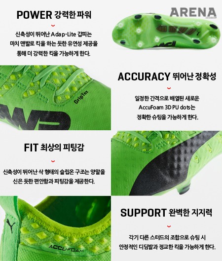 푸마 에보 파워는 보다 강력한 힘과 향상된 정밀도를 자랑한다. 축구화의 세로 방향으로만 신축성이 있는 소재로 만들어진 ‘어댑 라이트‘ 갑피는 마치 맨발로 킥을 하는 듯한 유연성을 느끼게 하며, 이를 통해 더 강력한 킥을 가능하게 한다. 그런가 하면, 갑피 안쪽에 새롭게 설계된 ‘아큐폼 3D’ 도트는 킥의 정확도를 높인다. 또한 ‘그립 텍스(GripTex)’는 푸마만의 기술로 젖은 상태에서도 볼의 그립감을 최상으로 유지시켜준다.