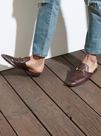 빈티지 워싱 데님 팬츠 91만원 생 로랑, 뒤축이 잘린 뮬 82만원 구찌 제품.