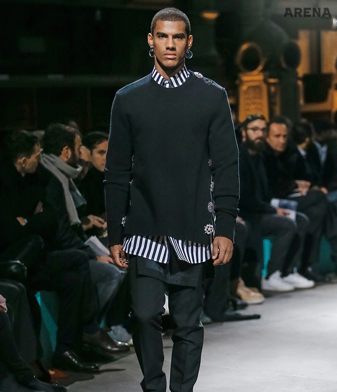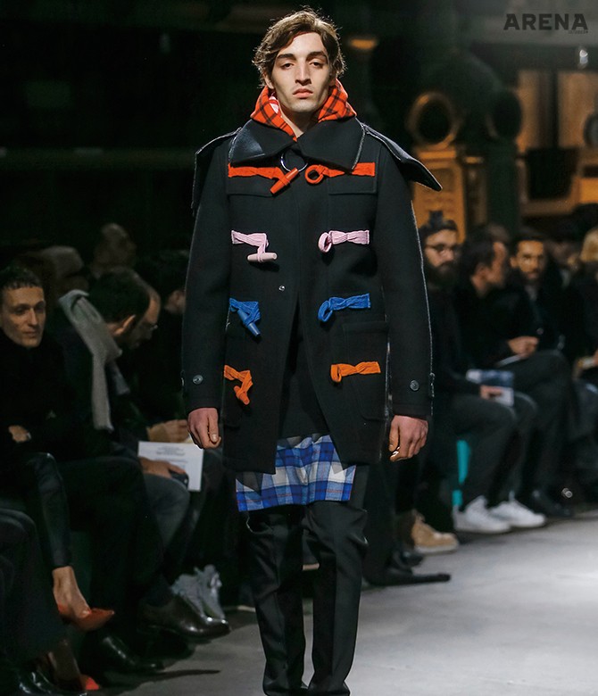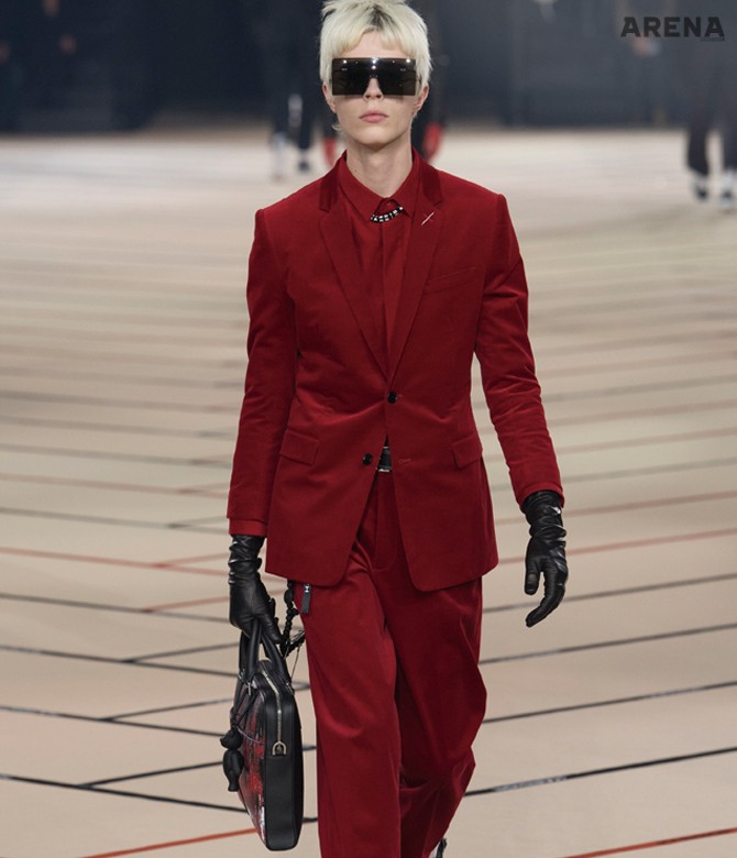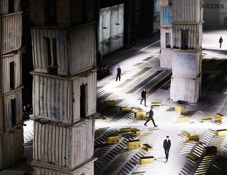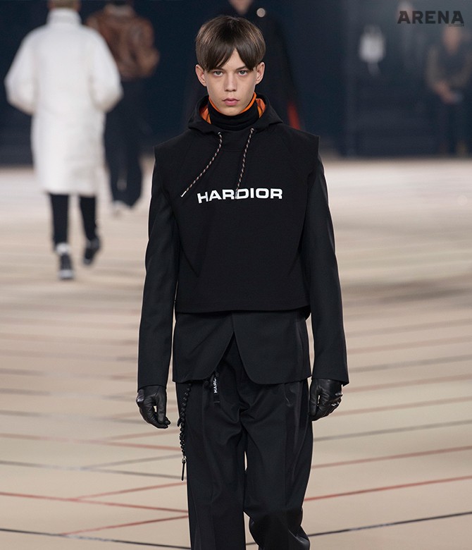 ‘저는 뭔가를 고대하고 잘 놀 줄 아는 사람이 좋습니다.’ 올해로 10주년을 맞이한 디올 옴므의 수장 크리스 반 아쉐는 그랑 팔레를 잘 노는 사람들의 놀이터로 만들었다. 수많은 삼각 깃발 그리고 그 깃발을 가로지르는 현란한 조명으로 천장을 장식하고, 바닥엔 박스 판지를 깐 후 ‘Hardior’이 적힌 테이프로 틈을 메웠다. 그곳에서 크리스 반 아쉐는 하드코어와 디올을 조합한 ‘하디올’이란 낯선 단어를 옷으로 설명했다. 무슈 디올을 연상시키는 가죽 장갑, 완벽한 재단에 클럽 문화와 유스 컬처를 절묘하게 섞은 옷차림이 그 증거다.