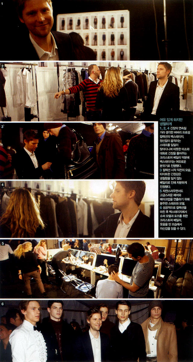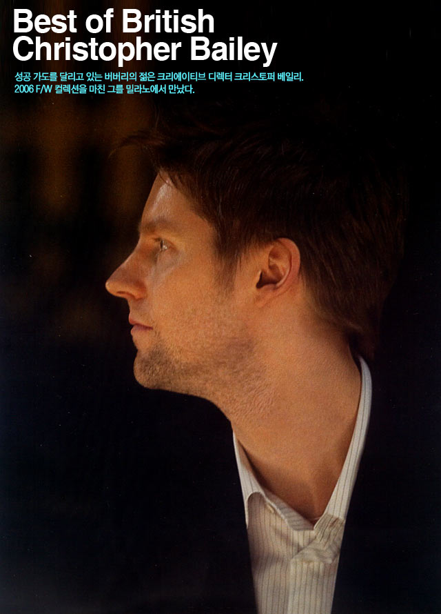 어제 컬렉션을 마쳐서 그런지 피곤한 기색이 역력하다. 컬렉션을 마친 소감은? 오랜 시간 빠듯한 일정과 긴장된 마음으로 컬렉션을 준비했다. 컬렉션을 마치면 그런 긴장이 한순간에 날아가 버려 묘한 느낌이 든다. 큰일을 성공적으로 마쳤다는 안도감과 편안함도 물론 있다. 중요한 시험을 마쳤다는 허탈감도 약간 느껴지고. 하지만 다음 프로젝트를 위해 바쁘게 움직여야 하기 때문에 또다시 일상으로 뛰어드는 내 모습을 발견하게 된다. 가끔 너무 바빠 피곤할 시간도 없는 듯하다. 이번 컬렉션에 대해 주위의 반응이 좋아 즐거운 마음으로 다음 프로젝트를 시작할 수 있을 것 같다. 매시즌 최고의 컬렉션이라는 찬사를 듣고 있다. 특별한 비결이 있는지? 정말인가? 그렇게 평가해주니 고맙다. 그런 특별한 비결이 있다면 내게 먼저 알려달라(하하하). 좋은 팀원들 때문에 매시즌 성공적인 컬렉션을 성공적으로 치르고 있다. 우리는 돈독한 팀워크를 바탕으로 도전 정신을 갖고 일한다. 나를 비롯한 모든 구성원이 버버리라는 브랜드, 버버리의 역사를 사랑하기 때문에 일을 즐기면서 한다. 누구든 자신의 일을 사랑하고 함께 일하는 사람들과 호흡이 잘 맞는다면 강한 시너지 효과를 얻을 수 있을 것이다. 당신이 디렉팅을 맡은 후로 버버리는 전통이 있는 브랜드에서 가장 핫한 브랜드로 탈바꿈했다. 그것을 실감하는가? 버버리가 전통 있는 브랜드라는 점은 변하지 않았다. 버버리에 합류하면서 내가 해야 할 일은 오래전 버버리가 누린 화려한 인기를 다시 불러일으키고, 사람들 사이에서 버버리가 이슈가 되도록 하는 것이었다. 버버리에서 일하는 사람들이 도전 정신을 갖고 일할 수 있도록 하는 것도 중요한 책임이었다. 그런 점에서 현재 많은 부분에서 성공을 거뒀다고 생각한다. 사실 처음 버버리를 맡았을 때는 이 정도까지의 성공을 예상하지는 못했다. 그리고 지금도 그 성공을 즐기고 만족할 만한 여유를 느끼지는 못한다. 계속되는 프로젝트를 위해 열심히 일에 매진하는 것이 현재 내가 할 일이라고 생각하고, 나는 그것을 즐기면서 하고 있다. 크리스토퍼 베일리가 만들어내는 버버리와 버버리 프로섬의 매력은 무엇인가? 버버리는 클래식한 브랜드면서 매우 민주적인 브랜드다. 버버리는 단순히 패션 피플만을 위한 브랜드가 아니며, 진부하거나 고루한 브랜드도 아니다. 버버리는 그 어떤 브랜드 못지않게 다양한 라인을 전개하며 다양한 연령과 계층의 사람들을 고객으로 받아들인다. 한가족을 예로 들면 전통을 중요시하는 아버지와 트렌드를 필요로 하는 젊은 아들, 귀여운 어린아이에 이르기까지 모든 구성원이 버버리를 즐길 수 있다. 이것이 바로 버버리의 매력이다. 버버리 프로섬은 그중에서도 가장 젊은 감각을 추구하고, 오늘날 자신을 당당하게 표현하는 젊은이를 위한 브랜드다. 현재 내 나이 또래 사람들, 그리고 앞으로 새롭게 부각될 새로운 세대를 위한 것이 바로 버버리 프로섬이다. 버버리 프로섬 컬렉션은 항상 트렌드를 정확히 예측한다는 얘기를 듣고 있다. 무엇을 통해 컬렉션의 아이디어를 얻는가? 이번 시즌엔 이것이 트렌드니까 컬렉션을 통해 꼭 소개해야겠다는 식으로 일을 하지는 않는다. 내 삶의 곳곳에서 느껴지는 이미지와 감성에서 영감을 얻어 컬렉션을 준비한다. 책이나 잡지를 읽으면서 문득 떠오르는 생각, 친구를 만나 대화를 나누면서 느끼는 감정, 파티장에서 느껴지는 분위기 등 삶의 곳곳에서 순간순간 영감을 받는다. 원단에서 느껴지는 감촉, 재킷을 입었을 때의 피팅감, 모델에게 옷을 입혀볼 때의 느낌 등 일을 하면서 떠오르는 생각이 가장 중요한 아이디어가 된다. 내 일을 즐기면서 하고 있기 때문에 이런 것들이 가능하다고 생각한다. 버버리의 모든 라인을 디렉팅하고 있는 것으로 알고 있다. 그중에서 가장 애착이 가는 라인은 무엇인가? 물론 버버리 프로섬이다. 버버리 프로섬은 나에게 어린 아기이자 자식 같은 존재다. 내가 버버리에 와서 처음 시작했고, 나와 함께 성장하고 있는 브랜드다. 버버리 프로섬은 단순히 트렌드를 추구하는 브랜드가 아니다. 버버리라는 전통 있는 브랜드에 기초를 두고 클래식을 함축하고 있기 때문에 더욱 매력적이다. 버버리 프로섬 남성 컬렉션도 그렇지만 여성 컬렉션도 성공적이라고 알고 있다. 여성복에 비해 남성복이 갖는 특별한 매력이 있다면? 아이템을 개발하거나 컬렉션을 준비할 때 남성복과 여성복에 차이를 두지는 않는다. 또한 남성복과 여성복을 막론하고 가장 중요한 것은 패션을 자신 있게 받아들이고, 즐길 수 있는 자세라고 생각한다. 버버리 남성복의 매력은 진지한 자세로 패션을 받아들이고 세련되게 즐기는 사람들에게 어필한다는 것이다. 슈즈·벨트·글로브 등 작은 액세서리를 만들 때조차 이러한 버버리의 세련되고 엘리건트한 매력을 조금이라도 잃지 않기 위해 노력한다. 올해로 버버리 론칭 1백50주년이 되었다. 특별히 기획하는 프로젝트가 있다면? 2006년은 버버리에게 매우 의미 있는 한 해가 될 것이다. 각종 파티와 전시회, 새로운 제품과 1백50주년 기념 제품 출시 등 다양한 행사를 준비