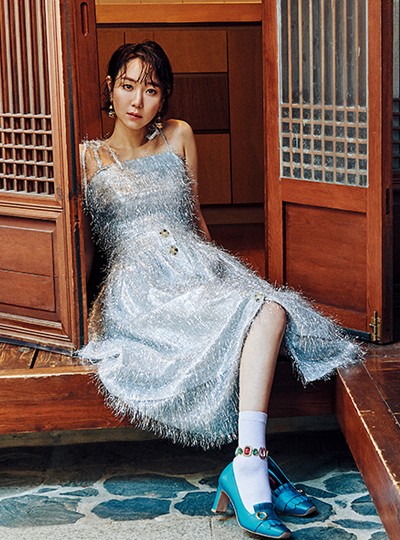 실버 드레스는 레지나 표 by 더블유컨셉, 귀고리와 발목에 찬 팔찌는 제이미 앤 벨, 파란색 슈즈는 데일라잇뉴욕 제품.
