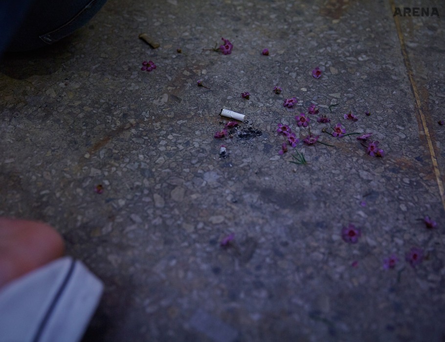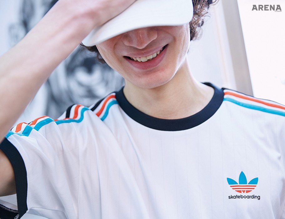 줄무늬 반소매 티셔츠 가격미정 아디다스 스케이트보딩, 카무플라주 패턴 저지 소재 반바지 3만5천원 H&M, 흰색 캡 6만8천원 캉골, 민트색 하이톱 스니커즈 5만7천원
