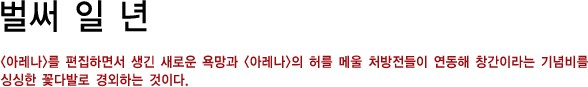 이 모든 건 다 ‘창간 1주년’이라는 영광스러운 기념비를 윤택한 녹지 위에 세우기 위한 우리 모두의 노력에서 비롯한 것이다. 그 노력은 당신이 알고 내가 알고 <아레나>가 안다. 그거면 됐다.