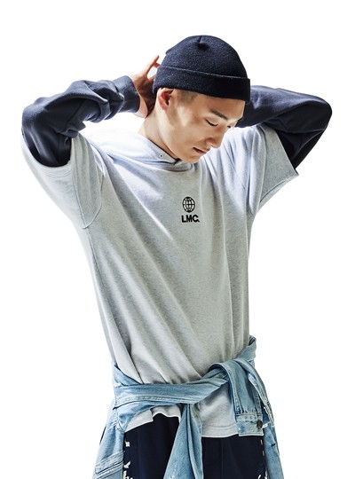 1 반소매 후드 티셔츠에 긴소매를 덧댄 티셔츠 7만9천원 LMC, 로고 무늬로 이뤄진 라이닝 장식의 트랙 팬츠 8만9천원 푸마, 허리에 두른 옅은 청색의 데님 재킷 26만9천원 캘빈클라인 진, 흰색 슈즈 가격미정 나이키 제품.