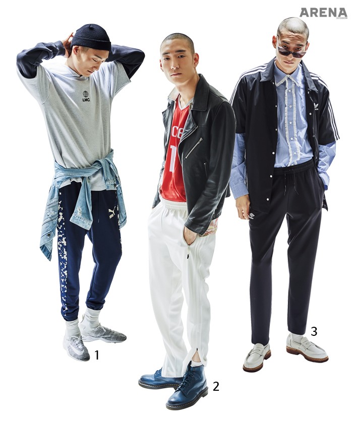 열정적인 스포츠맨 같은 트랙 팬츠는 건강하고 분방한 느낌 그대로 껄렁하게 연출한다.