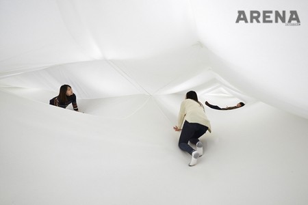 파리 팔레 드 도쿄와 베니스 건축비엔날레 특별전 등에 초대되며 이름을 알려온 뉴멘/포 유즈가 한국을 찾았다. 이태원 ‘스토리지’에서 열리는 첫 한국전을 위해서다. 전시의 메인 작품은 ‘보이드’. ‘빈 공간’이라는 뜻의 단어 ‘Void’를 썼다. 방대한 양의 하얀 천과 이를 지탱하는 구조적인 장치를 사용해 바닥과 천장 사이의 빈 공간에 다른 차원의 미로를 만들어냈다. 관객은 입구에 놓인 작은 계단을 올라, 뉴멘/포 유즈가 만든 하얀 터널로 들어서야만 한다. 예측 불가능하고 초현실적인, 예술적 감각과 지각을 열어젖히는 경험이 그 안에 있다. 그저 지켜보는 일만으로는 일말의 관람도 할 수 없다.