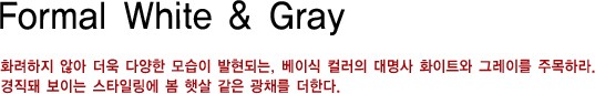 화려하지 않아 더욱 다양한 모습이 발현되는, 베이식 컬러의 대명사 화이트와 그레이를 주목하라. 경직돼 보이는 스타일링에 봄 햇살 같은 광채를 더한다.<br><br>[2007년 3월호]