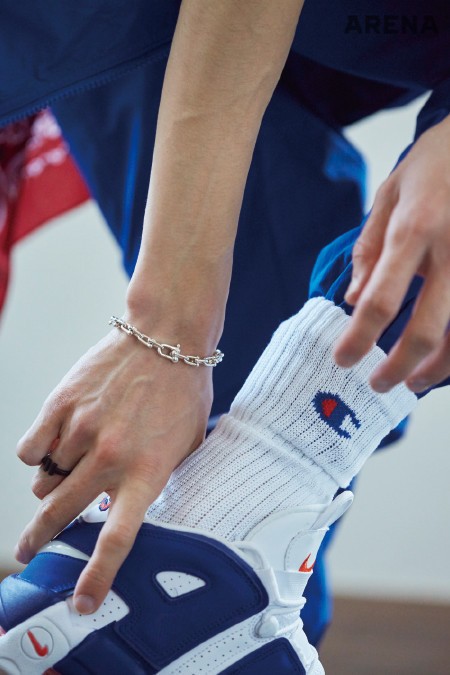 바람막이 점퍼 12만8천원 디스이즈네버댓, 트레이닝팬츠 13만9천원 아디다스 오리지널스, 운동화 18만원대 나이키, 양말 가격미정 챔피온, 체인 모양 스털링 실버 팔찌 72만원·블랙 코팅한 스틸 소재 T 스퀘어 반지 60만원 모두 티파니 제품.