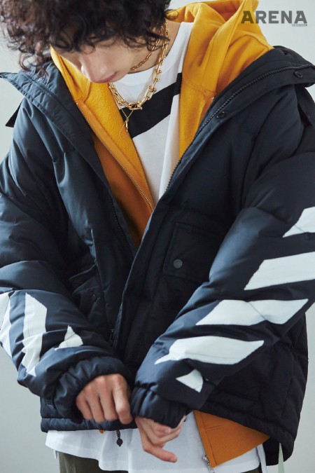 안에 입은 반소매 로고 티셔츠 가격미정 나이키, 겨자색 후드 집업 점퍼 8만5천원 위캔더스, 소매에 패턴을 새긴 패딩 재킷 가격미정 오프화이트 by 분더샵, 와이드 팬츠 가격미정 라코스테 패션쇼 컬렉션, 초커로 연출한 18K 골드 팔찌 9백65만원·중심으로 올수록 체인 굵기가 두꺼운 18K 골드 목걸이 1천4백10만원 모두 티파니, 자물쇠와 열쇠 펜던트 목걸이 가격미정 타사키 제품.