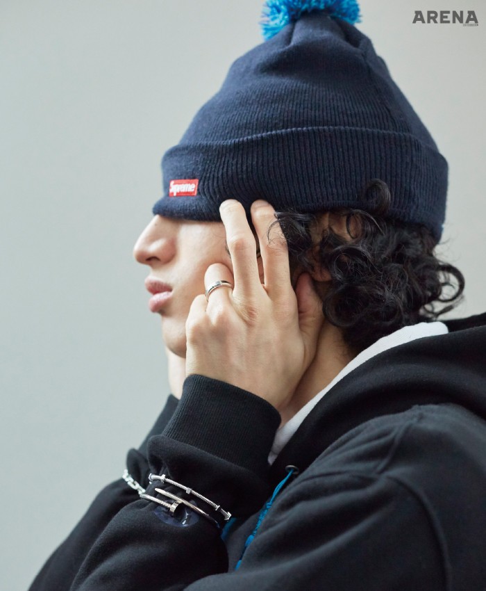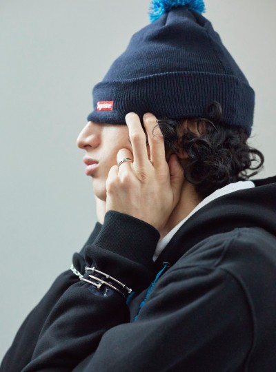 안에 입은 럭비 티셔츠 14만5천원 챔피온, 술 장식을 더한 후디 9만9천원 위빠남, 브랜드 로고를 전면에 새긴 비니 가격미정 슈프림, 왼손 약지의 화이트 골드 반지 2백만원대 피아제, (위부터) 볼트와 너트에서 영감받은 화이트 골드 팔찌 8백50만원대·못에서 영감받은 화이트 골드 스몰 사이즈 팔찌 8백70만원대 모두 까르띠에, 오른손 체인 모양 스털링 실버 팔찌 72만원 티파니 제품.