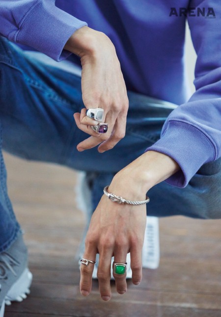 안에 입은 후디 46만원 준 지, 청 재킷 가격미정 오프화이트 by 분더샵, 오른손 팔찌 6백만원대 피아제, 왼손 검지의 18K 화이트 골드 반지·18K 핑크 골드 반지 모두 가격미정·약지에 낀 플래티넘 소재 반지 2백50만원 모두 쇼메 제품.