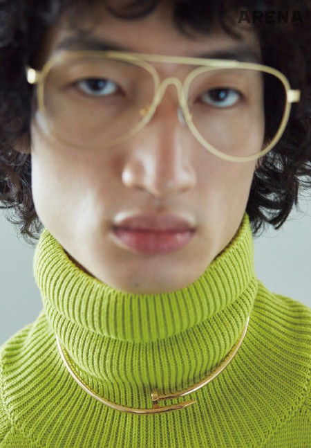 형광색 터틀넥 니트 가격미정 비슬로우, 금테 안경 22만원 스틸러, 못에서 영감받은 옐로 골드 초커 가격미정 까르띠에 제품.