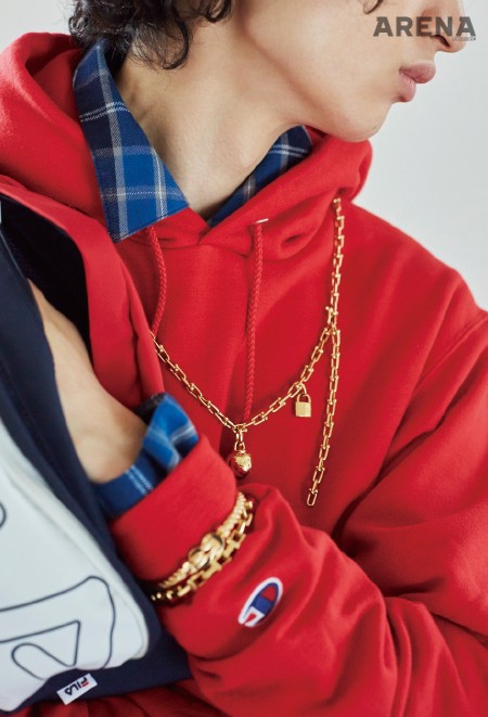 안에 입은 체크 셔츠 6만9천원 커버낫, 빨간색 후디 가격미정 챔피온 by ETC 서울, 어깨에 걸친 웨이스트 백 3만9천원 휠라 헤리티지, (위부터) 케이블 모양 옐로 골드 팔찌 가격미정 프레드, 18K 골드 팔찌 미디엄 사이즈 8백30만원·목걸이로 연출한 18K 골드 팔찌 9백65만원 모두 티파니 제품.