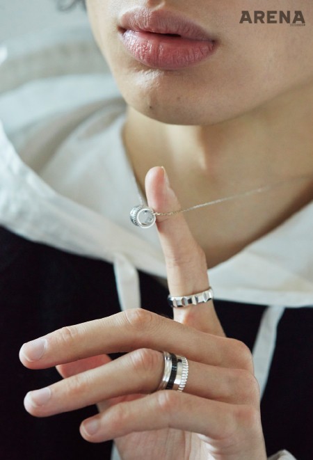 안에 입은 후디 셔츠 가격미정 87MM, 검은색 스웨터 가격미정 아미 by 매치스패션, 다이아몬드 16개를 파베 세팅한 화이트 골드 목걸이 1천만원대·검지의 화이트 골드 반지 2백만원대·약지의 화이트 골드와 블랙 PVD 소재를 사용한 반지 7백만원대 모두 부쉐론 제품.