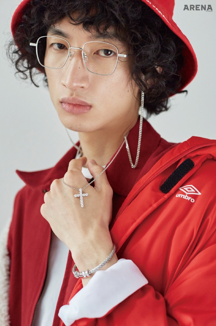 안에 입은 흰색 반소매 티셔츠 가격미정 푸마, 빨간색 블루종 14만9천원 위캔더스, 롱 패딩 재킷 가격미정 엄브로, 버킷 해트 3만2천원 위빠남, 은테 안경 가격미정 스틸러, 다이아몬드 십자가 펜던트 목걸이 가격미정 타사키, 케이블 모양 화이트 골드 팔찌 가격미정 프레드 제품.