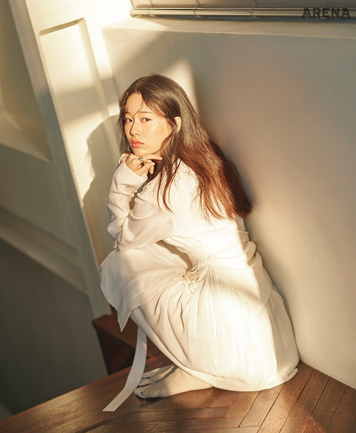 흰색 원피스는 일로, 반지는 해수엘, 양말은 스타일리스트 소장품.