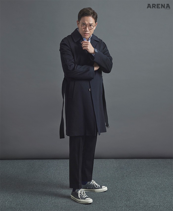 셔츠와 코트는 모두 라르디니 by 신세계인터내셔널, 모직 팬츠는 코스, 스니커즈는 컨버스, 안경은 키블리 제품.