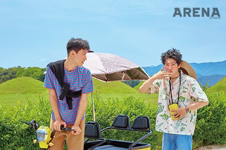(왼쪽부터) 카키색 피케 티셔츠·니트 베스트·목에 두른 스카프 모두 가격미정 라르디니 by 신세계인터내셔널, 포켓 팬츠 가격미정 이스트로그 by 솔티서울, 갈색 새철백 23만8천원 닥터마틴, 버킷 해트 가격미정 버버리, 레진 밴드 시계 가격미정 지샥, 갈색 샌들 35만9천원 파라부트 by 유니페어 제품.