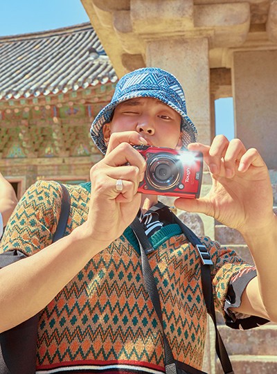 브이넥 니트 소재 반소매 톱·이너로 입은 꽃무늬 셔츠·파란색 버킷 해트·미니 크로스백·쇼퍼백 모두 가격미정 프라다, 초접사와 방수 기능이 있는 디지털카메라 가격미정 올림푸스 스타일러스 TG-5 제품.