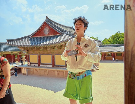 이너로 입은 줄무늬 티셔츠 8만9천원 리바이스, 포켓이 달린 사파리 재킷 가격미정 이스트로그 by 솔티 서울, 카키색 쇼츠 25만8천원 YMC, 어깨에 두른 패니백 16만1천원 프라이탁, 검은색 크로스백 4만9천원 엄브로, 양손에 든 기내용 캐리어·보스턴백 모두 가격미정 하트만, 갈색 로퍼 59만9천원 파라부트 by 유니페어 제품.