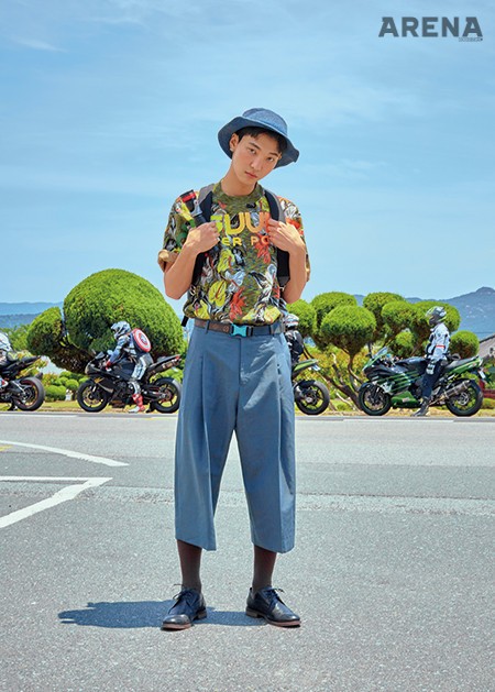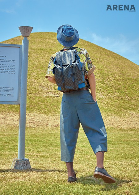 트로피컬 프린트 니트 소재 톱·회색 트라우저·벨트·데님 버킷 해트·백팩 모두 가격미정 루이 비통, 검은색 옥스퍼드화 25만원 락포트, 손전등 12만6천원 베어본즈 리빙 by 맨케이브 제품.