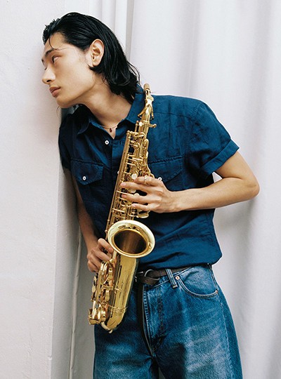 왼손에 착용한 갈색 카프스킨 스트랩과 짙은 블루 다이얼이 돋보이는 폴라리스 오토매틱 시계 가격미정 예거 르쿨트르, 새끼손가락에 착용한 3개의 브릴리언트 컷 다이아몬드를 그레인 세팅한 핑크 골드 반지 가격미정·오른손에 착용한 육각형의 벌집을 형상화한 핑크 골드 팔찌 6백만원대·13개의 브릴리언트 라운드 컷 다이아몬드를 그레인 세팅한 화이트 골드 팔찌 1천만원대·검지에 착용한 시크릿 다이아몬드를 세팅한 화이트 골드 반지 가격미정·약지에 착용한 날개 모양의 플래티넘 반지 2백만원대 모두 쇼메, 팬츠 가격미정 포저 제품.