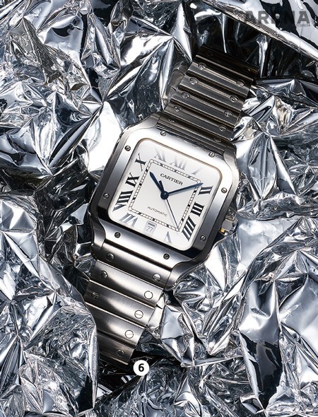 올해 새 단장을 마친 산토스 드 까르띠에는 스트랩과 케이스를 잇는 선을 날렵하게 정리했다. 그 결과 스테인리스 스틸의 특징을 살린 현대적이고 유연한 시계가 탄생했다. 베젤과 스트랩에 장식한 스크루 디테일은 시계를 더욱 단단해 보이게 만든다. 스트랩은 스틸 소재임에도 불구하고 손목 위에 안정적이고 편안하게 감긴다. 정밀한 수치까지 조정해 인체공학적으로 설계했기 때문. 이 시계는 특별히 까르띠에에서 특허 출원한 퀵 스위치 시스템을 적용했다. 이제 별다른 장비 없이 혼자서도 스트랩을 교체할 수 있게 됐다. 오토매틱 와인딩 1847 MC 칼리버를 장착한 크기 39.8×47.5 mm의 산토스 드 까르띠에 8백30만원대.