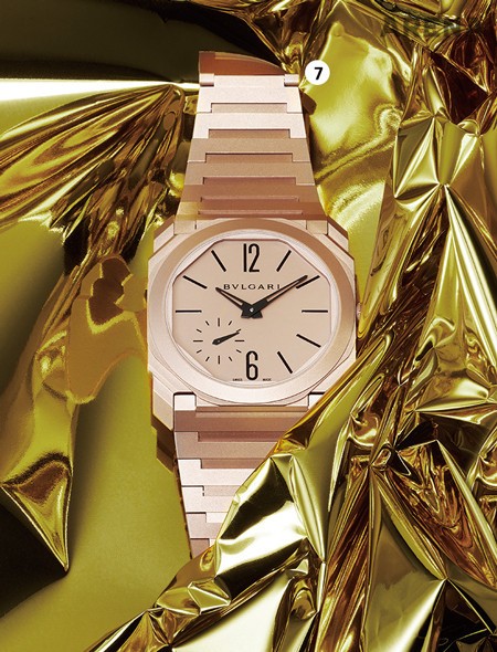 시계를 손목 위에 올려놓기 전에 여러 각도에서 빛을 비춰 감상해보자. 어디서도 본 적 없는 고유의 광택을 보게 될 텐데 이는 메탈 고유의 색을 유지하면서 매트하게 처리하는 기술인 샌드블라스트 덕이다. 촉감 또한 매력적이다. 흐르듯 유연한 금속 브레이슬릿은 가죽만큼이나 매끈하고 부드럽다. 요란한 빛이 아닌 은은하고 우아한 자태는 남성에게도 로즈골드 워치가 꽤 매력적임을 각인시켜준다. 18K 로즈 골드 케이스와 다이얼에 두께 2.23mm의 BVL 138 피니씨모 칼리버를 장착한 옥토 피니씨모 오토매틱 샌드블라스트 5천6백만원대.