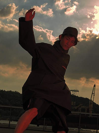 나일론 개버딘 소재의 검은색 아노락 재킷·나일론 개버딘 소재의 검은색 버뮤다 팬츠·검은색 니삭스·흰색 스니커즈 모두 가격미정 프라다 제품.