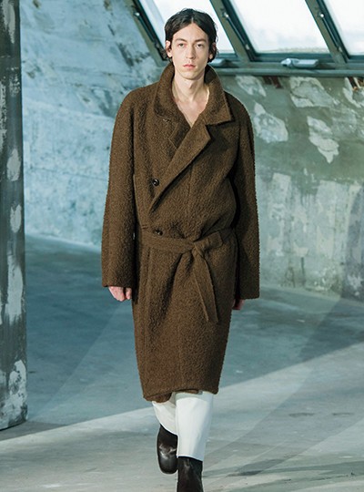 품이 넉넉한 코트로 여유롭게 몸을 감싸고, 허리끈은 느슨하게 아래로 내리고, 야무지게 매듭을 지은 다분히 의도적인 나른한 자태가 좋다. 어쩜 이렇게 부유한 색감을 낼까? 우직한 나무에 저물녘 빛이 내려앉은 것처럼 가장 부드러운 순간의 갈색, 포슬포슬한 소재의 느낌까지 따사롭다. 모델처럼 병약해 보이는 가느다란 남자여야 어울릴까? 글쎄. 크고 보드라운 소재의 코트라면 체격 좋은 사내들도 우아하게 만들어줄 것 같은데. EDITOR 최태경