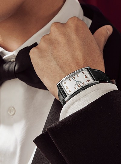 턱시도 차림에 우스워 보이지 않을 정도로 위트를 더하기란 쉽지 않다. 티파니 이스트 웨스트™ 시계라면 적절한 대안이 될 거다. 형태만 두고 보자면 훌륭한 비율을 자랑하는 직사각형 다이얼이지만 유심히 살피면 동과 서로 길게 뻗은 가로형 디자인이 시각적인 신선함을 준다. 가루를 뿌려 완성한 금빛 푸드레 인덱스와 블루 핸즈의 경쾌한 색 대비 역시 활력을 주는 요소. 셔츠 소매 아래로 살짝살짝 보이는 독특한 디자인은 그날의 소소한 이야깃거리가 될 거다. 가로·세로 사이즈 44×25mm, 쿼츠 무브먼트로 움직이는 시계 6백30만원.