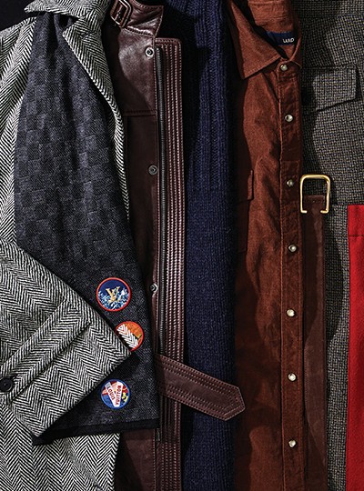 (왼쪽부터) 헤링본 코트 1백10만원대 드보 by 매치스패션닷컴, 로고 와펜 머플러 가격미정 루이 비통, 가죽 사파리 재킷 가격미정 맨온더분, 모크넥 스웨터 38만원 바버, 코듀로이 셔츠 39만원 라르디니 by 신세계인터내셔날, 스웨이드 소재 벨트 24만9천원 드레익스, 체크무늬 바지 31만8천원 타미×루이스 캡슐 컬렉션 제품.