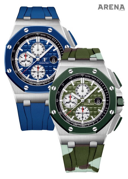 오데마 피게는 익스트림 스포츠 워치란 카테고리를 새롭게 만들었다는 평가를 받는 로열 오크 오프쇼어 컬렉션에 브라운 컬러와 블루, 그린 총 3가지 세라믹 모델을 추가했다. 베젤, 푸시 버튼, 스크루 록 크라운에 세라믹 소재를 적용하고, 세라믹 컬러와 색을 맞춘 다이얼은 특유의 메가 타피스리(Mega Tapisserie) 패턴으로 장식했다. 우수한 착용감을 자랑하는 부드럽고 유연한 러버 스트랩은 각 컬러와 맞는 카무플라주 무늬로 이뤄져 경쾌한 느낌. 블루와 그린 모델은 스테인리스 스틸 케이스를 적용했으며, 브라운 모델은 케이스에 18K 핑크 골드 소재를 사용하여 고급스러움을 더했다.