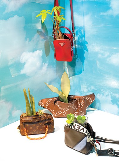 1 파키라+프라다 옹골찬 나무에 손바닥처럼 화려한 잎이 활짝 핀 파키라는 이산화탄소 제거 능력이 뛰어나다. 밝은 곳에 두고 일주일에 1회 정도 물만 주면 사람 키를 훌쩍 넘을 만큼 잘 자란다. 빨간색 미니 크로스백 가격미정 프라다 제품.