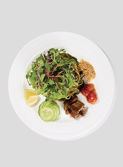 하루에 먹어야 하는 채소의 양을 넘길 수 있을 정도로 시금치를 많이 활용한 파스타다. 완성에 1년 반이 걸렸을 정도로 오랜 시간 연구한 페스토는 시금치와 양파 본연의 단맛을 극대화한 것이 가장 큰 특징이다. 데치지 않고 8시간 동안 저온에서 뭉근하게 끓인 시금치와 각종 채소를 더해 되직하게 만든 페스토는 적당한 굵기의 스파게티 면과 찰떡같이 조화를 이룬다. 그 위에 듬뿍 올린 어린 잎은 신선한 향을 더해준다. 이곳의 파스타는 마치 태국의 팟타이처럼 취향에 따라 더할 수 있게 사이드를 내어준다. 발사믹 드레싱에 재워 구운 방울토마토와 가지, 아몬드 가루, 오이, 레몬을 조금씩 더해가며 한 입씩 새로운 맛을 즐기는 것도 방법이다. 감칠맛을 원한다면 레몬을, 고소한 맛을 원하면 아몬드 가루를 뿌려 먹어보자. 보이는 것처럼 풀만 가득한 식사지만, 생각보다 매력적 맛에 빠져들 거다.
