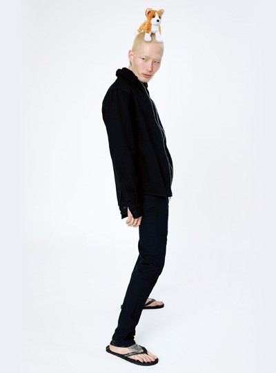 후드 장식이 달린 네오프렌 소재 블루종 37만원대·거칠게 워싱된 데님 팬츠 29만원대·검은색 플립플롭 9만원대 모두 아르마니 익스체인지 제품.