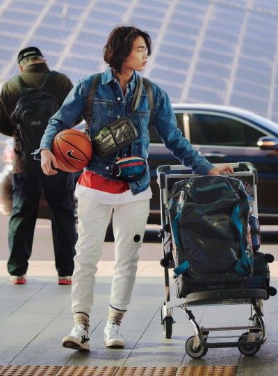 줄무늬 티셔츠·청 재킷 모두 가격미정 캘빈클라인 진, 흰색 트레이닝팬츠 28만5천원 C.P. 컴퍼니, 운동화 가격미정 아식스 타이거, 백팩 33만8천원·숄더백 19만8천원 모두 포터, 허리에 두른 힙팩 4만9천원·숄더백으로 활용 가능한 캐리어 52만9천원 모두 파타고니아, 농구공 가격미정 나이키 제품.