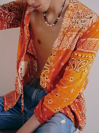 에스닉한 패턴의 기모노 셔츠 89만원대 캐피탈 by 미스터포터, 데님 팬츠 가격미정·빈티지한 가죽 벨트 13만9천원 모두 캘빈 클라인 진, 비즈 목걸이 42만원대 엠부쉬 by 미스터포터 제품.