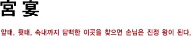 낯선 궁중 요리인 만큼 종업원들이 때때로 나오는 요리에 대해 이름과 먹는 법을 간단히 설명해준다. 웬만한 서양 요리보다 코스 사이의 시간이 길다. 그래서 때론 약간의 인내가 필요하다. 하지만 이렇게 기다리며, 식사와 함께 정담을 나누는 것 또한 궁중 요리의 매력이다.