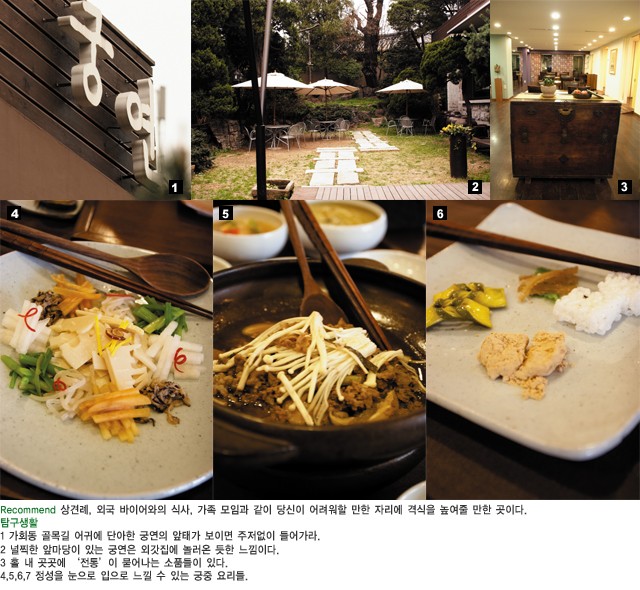 매일 먹는 한식인데, 궁연에서 맛본 한식은 낯설다. 서양식처럼 코스도 있고 가끔 어찌 젓가락을 움직여야 할지 당황케 만드는 요리들도 있다. 고운 한복 차림에 하얀 베 앞치마를 두른, 손이 야무진 여인이 만들었을 법한 궁중 요리. 식사 내내 누군가의 정성에 입 안이 부끄러울 정도로 황송하다. 융숭하게 대접해야 할 사람과 스스로 그만한 대접을 받고 싶은 날, 가회동 기와집 사이에 자리한 작은 궁궐을 찾아갔다.