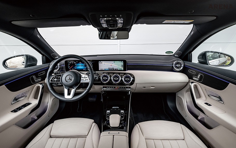문을 여는 순간 감탄사밖에 나오지 않았다. 사진으로 봤을 때 그 정도까진 아니었는데 신형 A클래스의 실내 디자인은 운전자의 눈을 홀리기 충분했다. 해치백의 모델 중 A클래스만큼 깔끔하고 고급스럽게 생긴 인테리어는 처음이었다. 가장 먼저 눈길이 간 곳은 옆으로 길게 뻗은 와이드 스크린이다. 계기반의 7인치, 센터페시아의 10.25인치 패널 두 장을 붙인 것으로 별도의 하우징을 씌우지 않아 시야가 시원하고 대시보드도 단정하다. 대시보드 양쪽 끝과 디스플레이 아래엔 터빈을 연상시키는 송풍구가 위치하는데 생김새가 굉장히 세련됐다. 송풍구 아래에 있는 공조 장치 버튼들은 간결하고 운전대는 해치백에 어울리지 않게 웅장하다. 그러고 보니 S클래스에 들어가는 운전대다. 좌우 스포크에 있는 기능의 구성은 거의 비슷하고 소재만 다르다. 사실 A클래스 실내를 자세히 둘러보면 많은 부분이 플라스틱으로 뒤덮여 있다. 하지만 사람들의 눈이 머무는 곳은 디자인과 소재에 포인트를 주고 소재와 소재 사이를 깔끔하게 마감하면서 플라스틱의 값싼 이미지를 말끔히 지웠다. 대시보드 아래쪽 표면을 탄소섬유처럼 처리한 건 엄지를 치켜세울 만하다. 벤츠에게는 값싼 소재도 비싸 보이게 만드는 기묘한 능력이 있는 것 같다. ★★★★