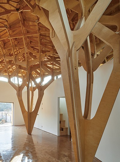 언젠가부터 요즘 건축은 표피에 의지하기 시작했다. 표피가 깔끔하면 디테일 있고, 생경한 재료를 쓰면 신선한 아이디어며, 아예 없애면 순수한 물성이다. 이런 상황이 불편했던 건축가 김재경은 콘크리트 매스와 표피에서 벗어난 건축을 찾다 ‘공포(栱包)’에 주목했다. 나무 기둥과 처마 지붕을 구조적으로 연결하는 공포는 동아시아 목조 건축의 백미다. 이런 요소가 강철, 유리, 콘크리트 등 새로운 건축 재료와 구조에 밀리지 않고 오히려 서로 엮이며 21세기 건축의 일정 지분을 갖는다면 어떨까. ‘세 그루 집’은 그 상상의 결과다. 여기에서 공포는 스스로 기둥이며 지붕을 견디는 구조물이다. 비현실적으로 이질적인 세 그루의 ‘진화 공포체’는 컴퓨테이션 디자인에 올라타 전통 형식을 깨며 형태적 자유를 얻었고, 목조 건축의 암묵지적 비밀은 디지털 패브리케이션으로 대체됐다. 급진적으로 진화한 목구조가 현실 속 외벽, 지붕과 결부된 이 가정집은 감히 흉내 못 낼 ‘변종 건축’의 성과다.