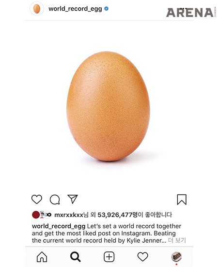 올해 초 인스타그램 계정 ‘월드 레코드 에그(@world_record_egg)’에 평범한 달걀 사진이 올라왔다. 코멘트에는 ‘함께 세계 기록을 세우고 인스타그램에서 가장 많은 반응을 얻자. 그리고 카일리 제너가 세운 세계 기록을 경신해보자’는 도전적인 발언을 했다. 카일리 제너가 2018년 2월 6일 갓 태어난 자신의 딸 사진을 게시하며 1천8백만 개 이상의 월드 레코드 ‘좋아요’ 기록을 언급한 것이다. 하지만 이 기록은 1년여 만에 덩그러니 달걀 하나 있는 사진에게 내주게 됐다. 업로드된 지 열흘도 채 안 돼 가장 많은 ‘좋아요’를 받은 게시물로 등극한 것. 이에 카일리 제너는 달걀을 아스팔트 바닥에 흘리는 게시물을 올리며 귀여운 복수를 했다. 세계 기록을 깬 달걀 사진은 현재 ‘좋아요’가 5천3백만여 개까지 늘어났으니 단순 해프닝치고는 놀라운 일이 아닐 수 없다.