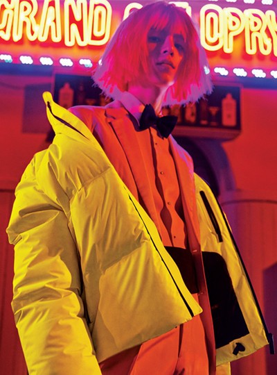 크리스털 장식 벨벳 턱시도 재킷 4백48만원·팬츠 가격미정 모두 제이백 쿠튀르, 형광 분홍색 터틀넥 톱·장갑 모두 가격미정 피플오브더월드, 네크리스 가격미정 베르사체 제품.