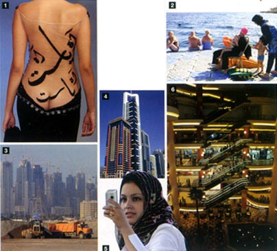 Arabia Now 1 레바논의 한 패션쇼에 나온 도발적인 의상. 등 뒤에 새겨진 글씨를 해석하면 Oh, hey lady! 2 이슬람식 수영복을 볼 수 있는 이집트의 홍해. 3 타워크레인이 하늘을 수놓은 두바이 외곽의 주마이라 지역 건설 현장. 4 다국적 기업과 금융 기관이 몰려 있는 셰이크 자이드 로드. 5 카메라 폰을 든 쿠웨이트 여성. 6 이집트 카이로의 소문난 쇼핑몰인 시티스타 풍경. |