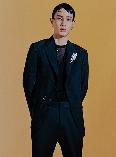 턱시도 재킷·턱시도 셔츠·트랙 팬츠·커머번드로 활용한 벨트팩·더비 슈즈·면도날 모티브 싱글 이어링·반지 모두 가격미정 발렌시아가 제품.