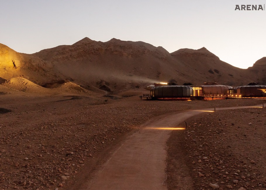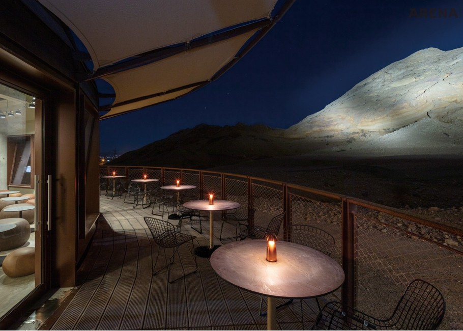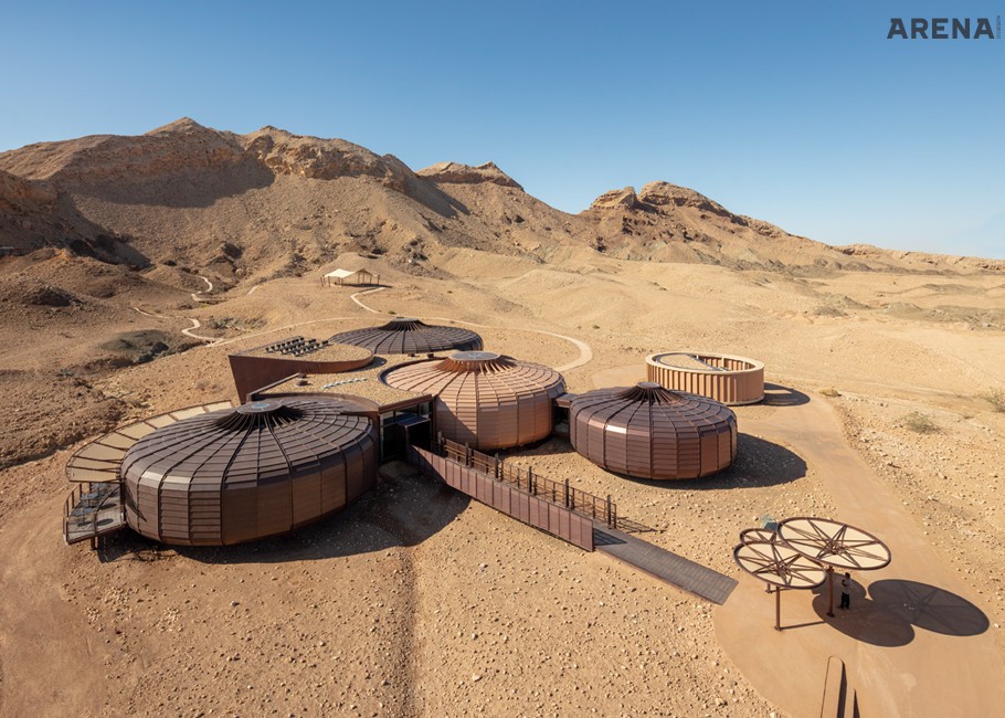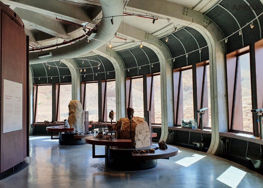부하이스 지올로지 파크는 아랍에미리트의 광활한 샤르자 사막에 위치한다. 사막에 덩그러니 놓인 갤러리라니. 낯설다. 모래 언덕을 등진 채 유선형으로 이어진 길 끝에 옹기종기 모여 있다. 공간의 역할에 따라 작고 크게 나뉘어 구조물의 크기가 다양하다. 모래 폭풍만이 흩날리는 척박한 사막을 가득 메우는 듯하다. 낮에는 구릿빛으로 빛나고 밤에는 주홍빛 조명이 모래 언덕을 비춘다. 이곳엔 65만 년 전부터 해양 화석들이 쌓여왔는데 부하이스 지올로지 파크는 화석의 모양을 닮았다. 갈라진 선들이 중심으로 모여 봉오리진 형태의 지붕, 건물의 둥그런 모양새가 그렇다. 외벽에는 금속을 입혀 금빛 샤르자 사막에 자연스레 스며들도록 했다. 외부 디자인은 햇빛을 받으면 반짝이는 모래와 조화를 이룬다. 자갈밭에서 솟아난 것 같은 철제 다리로 들어서면 부하이스 지올로지 파크 전시관이 이어진다. 이름에 걸맞게 지질학적 연구들을 전시한다. 다양한 화석과 암석들을 만져보고 탐구할 수 있다. 사막에 박힌 암석들을 관측하는 망원경도 있다. 전시관 외의 공간으로는 카페테리아가 있다. 카페테리아 밖으로 길게 늘어진 테라스에서 바라본 대지는 경이롭다.
