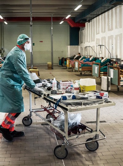 코로나 바이러스가 이탈리아 북부 지역을 강타하면서 롬바르디아 지역 병원은 전선 최전방이 됐다. 바이러스와 치열한 투쟁을 벌이고 있으며, 적막에 휩싸인 환자들은 공포 어린 얼굴을 한 채 응급실로 몰려든다. 사진의 장소는 브레시아 병원 근처 세탁소를 개조한 임시 병동이다. 지난 3월 중순 이탈리아 북부는 전 세계적인 전염병의 진원지가 됐다. 코로나 바이러스는 수만 명의 이탈리아인을 감염시켰고, 유럽 최고령 인구가 밀집한 나라를 철저히 파괴했다. 서양에서 처음 바이러스가 폭발한 롬바르디아 지역에서는 부유하고 선진적인 건강 관리 문화가 정착된 지역이다. 하지만 하루아침에 전쟁터로 변모했다. 병원들은 집중 치료 수용 인원을 확장했고, 복도를 포함한 병동 전체에 환풍기와 산소 탱크, 침대를 갖추도록 했다. 의사, 간호사, 구급대원 그리고 자원봉사자들은 쉬지 않고 밤낮으로 이 전선의 최전방을 지킬 수밖에 없었다.