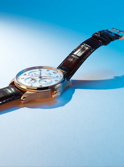 1980년대 전설적인 워치메이커 커트 클라우스가 개발한 퍼페추얼 캘린더는 아직까지도 IWC를 대표하는 컴플리케이션 시계에 탑재되고 있다. 포르투기저 퍼페추얼 캘린더는 IWC 제품에서는 최초로 자체 제작한 82000 칼리버를 탑재한 모델이고 60시간 파워 리저브를 지원한다. 둥근 다이얼 위에 가독성 좋은 크기의 인덱스와 3시, 6시, 9시에 배치된 날짜, 월, 요일 디스플레이로 IWC답게 남성적이고 멀끔한 얼굴. 각각의 서브 디스플레이들은 완벽하게 동기화돼 있어 하나의 크라운으로 손쉽게 조정할 수 있는 것 역시 장점이다. 월을 표시하는 디스플레이에서 퍼페추얼 문페이즈를 함께 볼 수 있는데, 실제 달의 궤도와 오차는 약 5백77년 중 1일에 불과하다고. IWC의 기술력과 견고함, 정확성을 지름 42mm의 골드 케이스에 집약한 시계.
