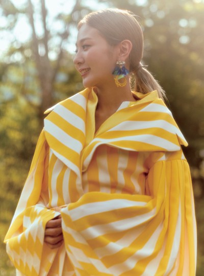 노란색 줄무늬 배팅 슬리브 재킷 손정완, 플라워 이어링 체인지 오브 하트 제품.